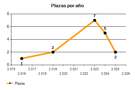 En los siguientes gráficos se puede ver la evolución del número de convocatorias y plazas convocadas para la profesión de Monitor y Animador Deportivo en Teruel de los últimos años pudiéndose observar una caída del 66,67% desde el año 2016 hasta el 2025 en número de convocatorias y un crecimiento del 100,00% en número de plazas convocadas.