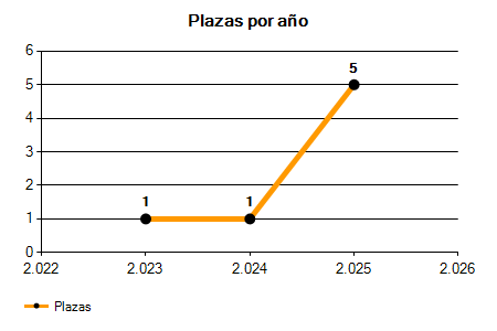 En los siguientes gráficos se puede ver la evolución del número de convocatorias y plazas convocadas para la profesión de Oficial Conductor-Palista en Tarragona de los últimos años pudiéndose observar un crecimiento del 100,00% desde el año 2023 hasta el 2025 en número de convocatorias y un crecimiento del 400,00% en número de plazas convocadas.
