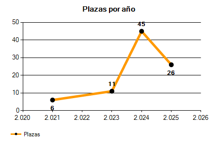 En los siguientes gráficos se puede ver la evolución del número de convocatorias y plazas convocadas para la profesión de Oficial de 1ª Oficios Varios en Vizcaya de los últimos años pudiéndose observar un crecimiento del 66,67% desde el año 2021 hasta el 2025 en número de convocatorias y un crecimiento del 333,33% en número de plazas convocadas.