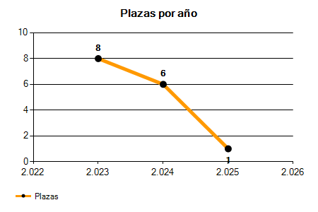 En los siguientes gráficos se puede ver la evolución del número de convocatorias y plazas convocadas para la profesión de Oficial de Explotación y Obras en Girona de los últimos años pudiéndose observar una caída del 83,33% desde el año 2023 hasta el 2025 en número de convocatorias y una caída del 87,50% en número de plazas convocadas.