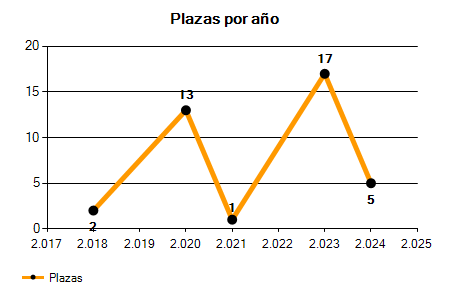 En los siguientes gráficos se puede ver la evolución del número de convocatorias y plazas convocadas para la profesión de Oficial de Explotación y Obras en Málaga de los últimos años pudiéndose observar una caída del 100,00% desde el año 2018 hasta el 2025 en número de convocatorias y una caída del 100,00% en número de plazas convocadas.
