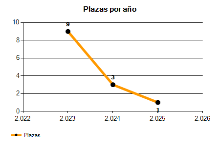 En los siguientes gráficos se puede ver la evolución del número de convocatorias y plazas convocadas para la profesión de Oficial de Mantenimiento en Córdoba de los últimos años pudiéndose observar una caída del 83,33% desde el año 2023 hasta el 2025 en número de convocatorias y una caída del 88,89% en número de plazas convocadas.