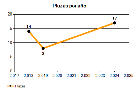 En los siguientes gráficos se puede ver la evolución del número de convocatorias y plazas convocadas para la profesión de Oficial de Planta Potabilizadora en Zaragoza de los últimos años pudiéndose observar una caída del 100,00% desde el año 2018 hasta el 2025 en número de convocatorias y una caída del 100,00% en número de plazas convocadas.