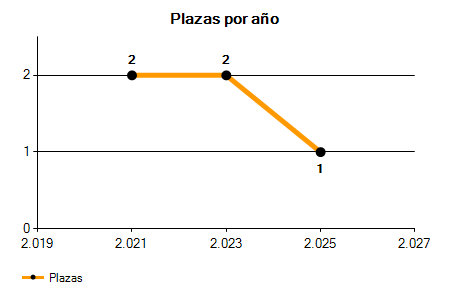 En los siguientes gráficos se puede ver la evolución del número de convocatorias y plazas convocadas para la profesión de Oficial Mantenimiento Piscina en Jaén de los últimos años pudiéndose observar un crecimiento y una caída del 0,00% desde el año 2021 hasta el 2025 en número de convocatorias y una caída del 50,00% en número de plazas convocadas.