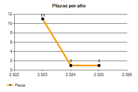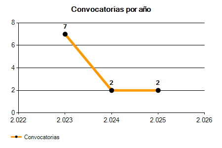En los siguientes gráficos se puede ver la evolución del número de convocatorias y plazas convocadas para la profesión de Operario/a de la Brigada Municipal en Girona de los últimos años pudiéndose observar una caída del 71,43% desde el año 2023 hasta el 2025 en número de convocatorias y una caída del 90,91% en número de plazas convocadas.