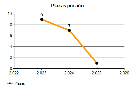 En los siguientes gráficos se puede ver la evolución del número de convocatorias y plazas convocadas para la profesión de Operario/a de la Brigada Municipal en Lleida de los últimos años pudiéndose observar una caída del 85,71% desde el año 2023 hasta el 2025 en número de convocatorias y una caída del 88,89% en número de plazas convocadas.