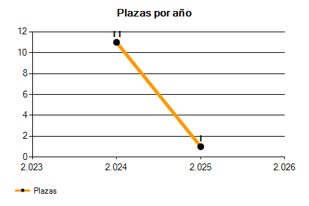 En los siguientes gráficos se puede ver la evolución del número de convocatorias y plazas convocadas para la profesión de Peón brigada en Balears de los últimos años pudiéndose observar una caída del 88,89% desde el año 2024 hasta el 2025 en número de convocatorias y una caída del 90,91% en número de plazas convocadas.