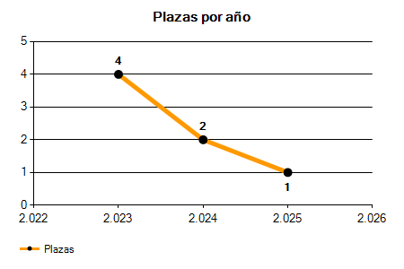 En los siguientes gráficos se puede ver la evolución del número de convocatorias y plazas convocadas para la profesión de Peón de Obras en Castellón de la Plana de los últimos años pudiéndose observar una caída del 50,00% desde el año 2023 hasta el 2025 en número de convocatorias y una caída del 75,00% en número de plazas convocadas.