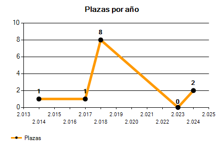 En los siguientes gráficos se puede ver la evolución del número de convocatorias y plazas convocadas para la profesión de Pintor en Murcia de los últimos años pudiéndose observar una caída del 100,00% desde el año 2014 hasta el 2025 en número de convocatorias y una caída del 100,00% en número de plazas convocadas.