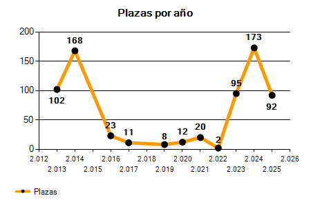 En los siguientes gráficos se puede ver la evolución del número de convocatorias y plazas convocadas para la profesión de Policía local en Girona de los últimos años pudiéndose observar una caída del 30,36% desde el año 2013 hasta el 2025 en número de convocatorias y una caída del 9,80% en número de plazas convocadas.
