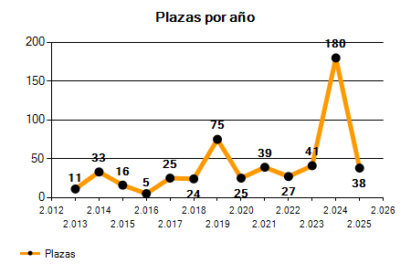 En los siguientes gráficos se puede ver la evolución del número de convocatorias y plazas convocadas para la profesión de Policía local en Granada de los últimos años pudiéndose observar un crecimiento del 111,11% desde el año 2013 hasta el 2025 en número de convocatorias y un crecimiento del 245,45% en número de plazas convocadas.
