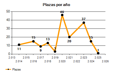 En los siguientes gráficos se puede ver la evolución del número de convocatorias y plazas convocadas para la profesión de Policía local en Guadalajara de los últimos años pudiéndose observar una caída del 66,67% desde el año 2014 hasta el 2025 en número de convocatorias y una caída del 90,91% en número de plazas convocadas.