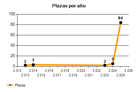 En los siguientes gráficos se puede ver la evolución del número de convocatorias y plazas convocadas para la profesión de Profesor en Barcelona de los últimos años pudiéndose observar un crecimiento del 242,86% desde el año 2013 hasta el 2025 en número de convocatorias y un crecimiento del 4.100,00% en número de plazas convocadas.
