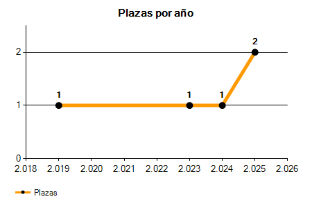 En los siguientes gráficos se puede ver la evolución del número de convocatorias y plazas convocadas para la profesión de Profesor de Danza en Coruña,A de los últimos años pudiéndose observar un crecimiento y una caída del 0,00% desde el año 2019 hasta el 2025 en número de convocatorias y un crecimiento del 100,00% en número de plazas convocadas.