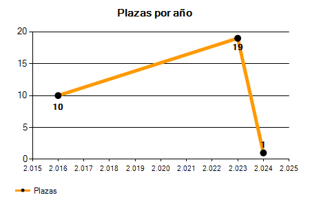 En los siguientes gráficos se puede ver la evolución del número de convocatorias y plazas convocadas para la profesión de Profesor de E.Música - Conservatorio en Pontevedra de los últimos años pudiéndose observar una caída del 100,00% desde el año 2016 hasta el 2025 en número de convocatorias y una caída del 100,00% en número de plazas convocadas.
