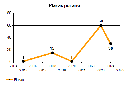 En los siguientes gráficos se puede ver la evolución del número de convocatorias y plazas convocadas para la profesión de Profesor de E.Música - Conservatorio en Valencia de los últimos años pudiéndose observar una caída del 100,00% desde el año 2015 hasta el 2025 en número de convocatorias y una caída del 100,00% en número de plazas convocadas.