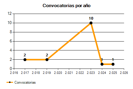 En los siguientes gráficos se puede ver la evolución del número de convocatorias y plazas convocadas para la profesión de Profesor de E.Música - Conservatorio en Vizcaya de los últimos años pudiéndose observar una caída del 50,00% desde el año 2017 hasta el 2025 en número de convocatorias y una caída del 54,55% en número de plazas convocadas.
