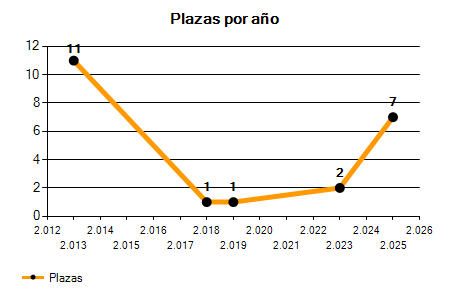 En los siguientes gráficos se puede ver la evolución del número de convocatorias y plazas convocadas para la profesión de Profesor en Valencia de los últimos años pudiéndose observar un crecimiento y una caída del 0,00% desde el año 2013 hasta el 2025 en número de convocatorias y una caída del 36,36% en número de plazas convocadas.