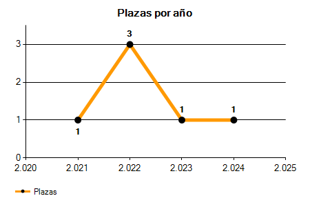 En los siguientes gráficos se puede ver la evolución del número de convocatorias y plazas convocadas para la profesión de Programador/a Gestión de Expedientes en Pontevedra de los últimos años pudiéndose observar una caída del 100,00% desde el año 2021 hasta el 2025 en número de convocatorias y una caída del 100,00% en número de plazas convocadas.