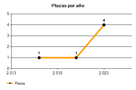 En los siguientes gráficos se puede ver la evolución del número de convocatorias y plazas convocadas para la profesión de Secretaria en Almería de los últimos años pudiéndose observar una caída del 100,00% desde el año 2016 hasta el 2025 en número de convocatorias y una caída del 100,00% en número de plazas convocadas.