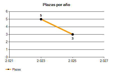 En los siguientes gráficos se puede ver la evolución del número de convocatorias y plazas convocadas para la profesión de Secretaria en Girona de los últimos años pudiéndose observar una caída del 40,00% desde el año 2023 hasta el 2025 en número de convocatorias y una caída del 40,00% en número de plazas convocadas.