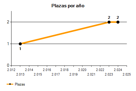 En los siguientes gráficos se puede ver la evolución del número de convocatorias y plazas convocadas para la profesión de Secretaria en Guipúzcoa de los últimos años pudiéndose observar una caída del 100,00% desde el año 2013 hasta el 2025 en número de convocatorias y una caída del 100,00% en número de plazas convocadas.