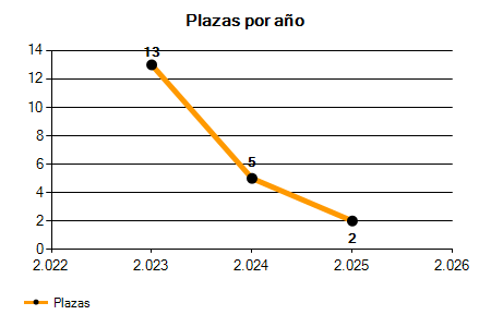En los siguientes gráficos se puede ver la evolución del número de convocatorias y plazas convocadas para la profesión de Secretaria en Lleida de los últimos años pudiéndose observar una caída del 86,67% desde el año 2023 hasta el 2025 en número de convocatorias y una caída del 84,62% en número de plazas convocadas.