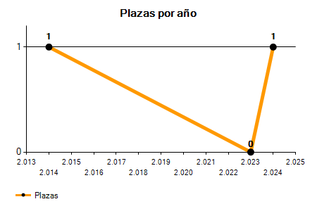 En los siguientes gráficos se puede ver la evolución del número de convocatorias y plazas convocadas para la profesión de Socorrista en Balears de los últimos años pudiéndose observar una caída del 100,00% desde el año 2014 hasta el 2025 en número de convocatorias y una caída del 100,00% en número de plazas convocadas.
