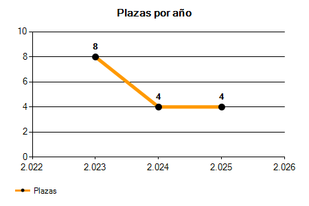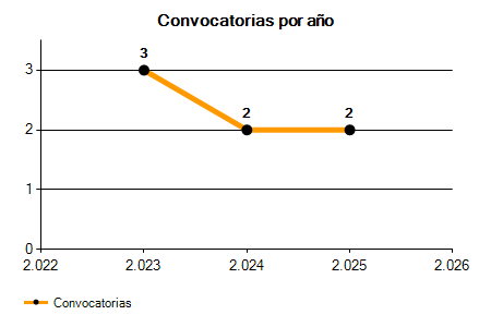 En los siguientes gráficos se puede ver la evolución del número de convocatorias y plazas convocadas para la profesión de Socorrista en Burgos de los últimos años pudiéndose observar una caída del 33,33% desde el año 2023 hasta el 2025 en número de convocatorias y una caída del 50,00% en número de plazas convocadas.