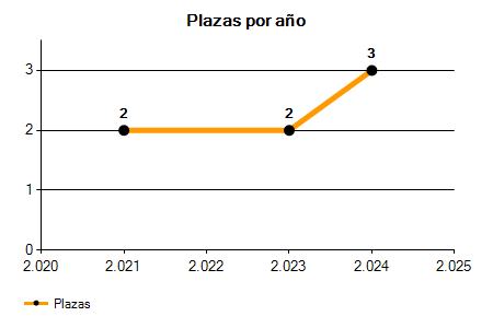 En los siguientes gráficos se puede ver la evolución del número de convocatorias y plazas convocadas para la profesión de Socorrista en Huesca de los últimos años pudiéndose observar una caída del 100,00% desde el año 2021 hasta el 2025 en número de convocatorias y una caída del 100,00% en número de plazas convocadas.