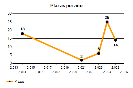 En los siguientes gráficos se puede ver la evolución del número de convocatorias y plazas convocadas para la profesión de Socorrista en Valencia de los últimos años pudiéndose observar un crecimiento y una caída del 0,00% desde el año 2014 hasta el 2025 en número de convocatorias y una caída del 22,22% en número de plazas convocadas.