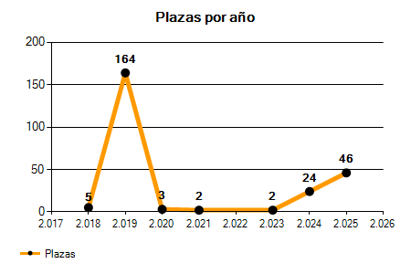 En los siguientes gráficos se puede ver la evolución del número de convocatorias y plazas convocadas para la profesión de Subalterno en Vizcaya de los últimos años pudiéndose observar un crecimiento del 400,00% desde el año 2018 hasta el 2025 en número de convocatorias y un crecimiento del 820,00% en número de plazas convocadas.