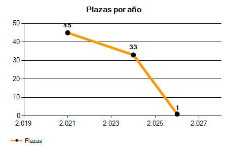 En los siguientes gráficos se puede ver la evolución del número de convocatorias y plazas convocadas para la profesión de Técnico/a Superior en Tecnologías de la Información y la Comunicación (TIC) en Madrid de los últimos años pudiéndose observar una caída del 50,00% desde el año 2021 hasta el 2026 en número de convocatorias y una caída del 97,78% en número de plazas convocadas.