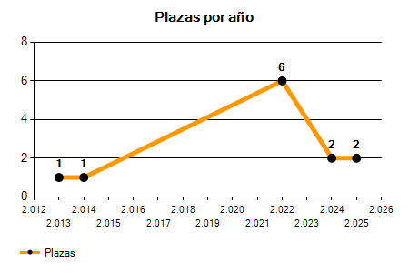 En los siguientes gráficos se puede ver la evolución del número de convocatorias y plazas convocadas para la profesión de Técnico administración especial en Palmas,Las de los últimos años pudiéndose observar un crecimiento y una caída del 0,00% desde el año 2013 hasta el 2025 en número de convocatorias y un crecimiento del 100,00% en número de plazas convocadas.