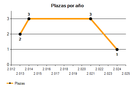 En los siguientes gráficos se puede ver la evolución del número de convocatorias y plazas convocadas para la profesión de Técnico administración especial en Tarragona de los últimos años pudiéndose observar una caída del 100,00% desde el año 2013 hasta el 2025 en número de convocatorias y una caída del 100,00% en número de plazas convocadas.