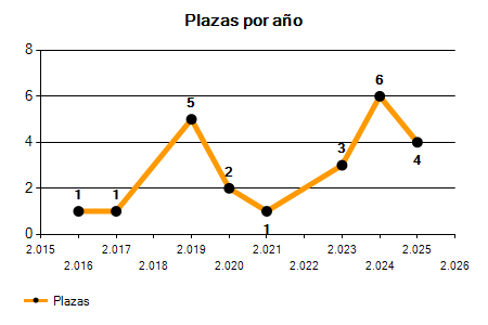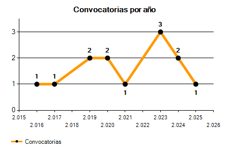 En los siguientes gráficos se puede ver la evolución del número de convocatorias y plazas convocadas para la profesión de Técnico de Deportes en Almería de los últimos años pudiéndose observar un crecimiento y una caída del 0,00% desde el año 2016 hasta el 2025 en número de convocatorias y un crecimiento del 300,00% en número de plazas convocadas.