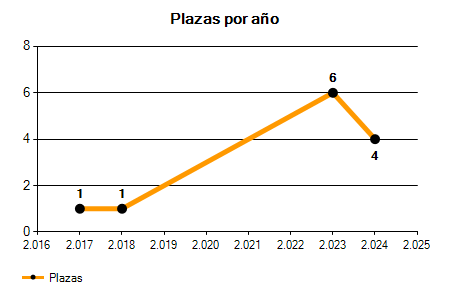 En los siguientes gráficos se puede ver la evolución del número de convocatorias y plazas convocadas para la profesión de Técnico de Deportes en Córdoba de los últimos años pudiéndose observar una caída del 100,00% desde el año 2017 hasta el 2025 en número de convocatorias y una caída del 100,00% en número de plazas convocadas.