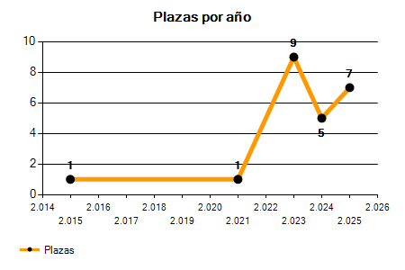 En los siguientes gráficos se puede ver la evolución del número de convocatorias y plazas convocadas para la profesión de Técnico de Deportes en Coruña,A de los últimos años pudiéndose observar un crecimiento del 300,00% desde el año 2015 hasta el 2025 en número de convocatorias y un crecimiento del 600,00% en número de plazas convocadas.