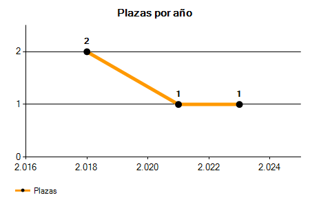 En los siguientes gráficos se puede ver la evolución del número de convocatorias y plazas convocadas para la profesión de Técnico de Deportes en Toledo de los últimos años pudiéndose observar una caída del 100,00% desde el año 2018 hasta el 2025 en número de convocatorias y una caída del 100,00% en número de plazas convocadas.