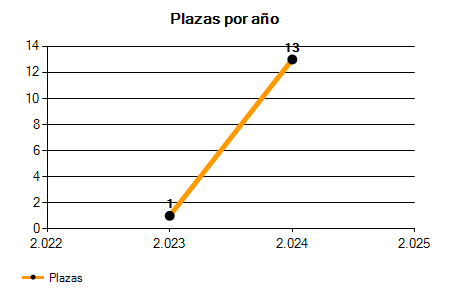 En los siguientes gráficos se puede ver la evolución del número de convocatorias y plazas convocadas para la profesión de Técnico de Empleo en Palmas,Las de los últimos años pudiéndose observar una caída del 100,00% desde el año 2023 hasta el 2025 en número de convocatorias y una caída del 100,00% en número de plazas convocadas.