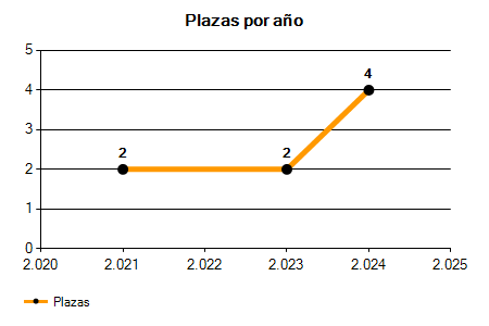 En los siguientes gráficos se puede ver la evolución del número de convocatorias y plazas convocadas para la profesión de Técnico de Juventud, Mujer e Igualdad en Murcia de los últimos años pudiéndose observar una caída del 100,00% desde el año 2021 hasta el 2025 en número de convocatorias y una caída del 100,00% en número de plazas convocadas.