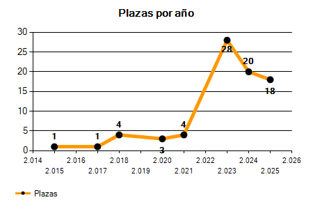 En los siguientes gráficos se puede ver la evolución del número de convocatorias y plazas convocadas para la profesión de Técnico de Promoción Económica en Barcelona de los últimos años pudiéndose observar un crecimiento del 150,00% desde el año 2015 hasta el 2025 en número de convocatorias y un crecimiento del 1.700,00% en número de plazas convocadas.