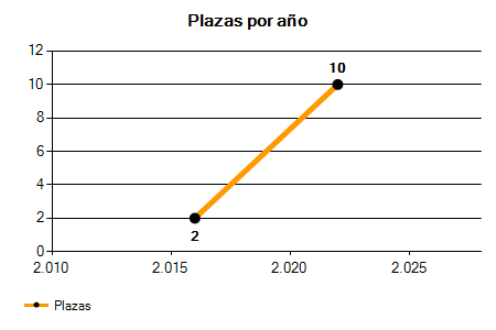 En los siguientes gráficos se puede ver la evolución del número de convocatorias y plazas convocadas para la profesión de Técnico de Promoción Económica en Salamanca de los últimos años pudiéndose observar una caída del 100,00% desde el año 2016 hasta el 2025 en número de convocatorias y una caída del 100,00% en número de plazas convocadas.