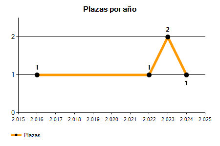 En los siguientes gráficos se puede ver la evolución del número de convocatorias y plazas convocadas para la profesión de Técnico de Promoción Económica en Tarragona de los últimos años pudiéndose observar una caída del 100,00% desde el año 2016 hasta el 2025 en número de convocatorias y una caída del 100,00% en número de plazas convocadas.