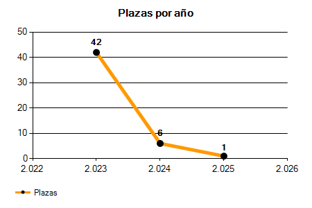 En los siguientes gráficos se puede ver la evolución del número de convocatorias y plazas convocadas para la profesión de Técnico en Educación Infantil en Cuenca de los últimos años pudiéndose observar una caída del 80,00% desde el año 2023 hasta el 2025 en número de convocatorias y una caída del 97,62% en número de plazas convocadas.