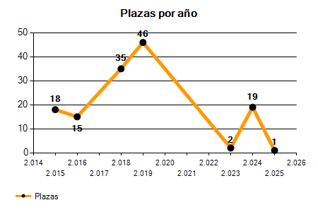En los siguientes gráficos se puede ver la evolución del número de convocatorias y plazas convocadas para la profesión de Técnico Hacienda en Guipúzcoa de los últimos años pudiéndose observar un crecimiento y una caída del 0,00% desde el año 2015 hasta el 2025 en número de convocatorias y una caída del 94,44% en número de plazas convocadas.