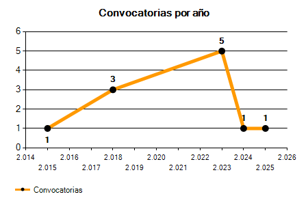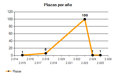 En los siguientes gráficos se puede ver la evolución del número de convocatorias y plazas convocadas para la profesión de Tecnico Medio Ambiente en Palmas,Las de los últimos años pudiéndose observar un crecimiento y una caída del 0,00% desde el año 2015 hasta el 2025 en número de convocatorias y un crecimiento y una caída del 0,00% en número de plazas convocadas.
