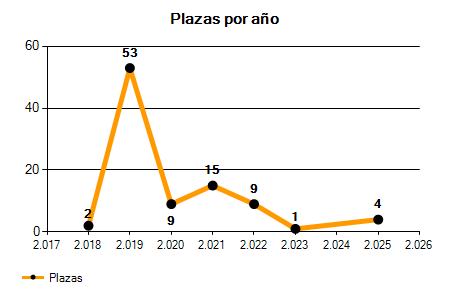 En los siguientes gráficos se puede ver la evolución del número de convocatorias y plazas convocadas para la profesión de Técnico Superior Jurídico en Barcelona de los últimos años pudiéndose observar un crecimiento del 50,00% desde el año 2018 hasta el 2025 en número de convocatorias y un crecimiento del 100,00% en número de plazas convocadas.