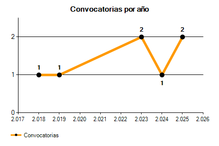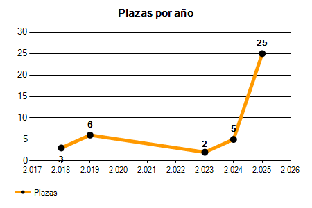 En los siguientes gráficos se puede ver la evolución del número de convocatorias y plazas convocadas para la profesión de Vigilante en Cantabria de los últimos años pudiéndose observar un crecimiento del 100,00% desde el año 2018 hasta el 2025 en número de convocatorias y un crecimiento del 733,33% en número de plazas convocadas.