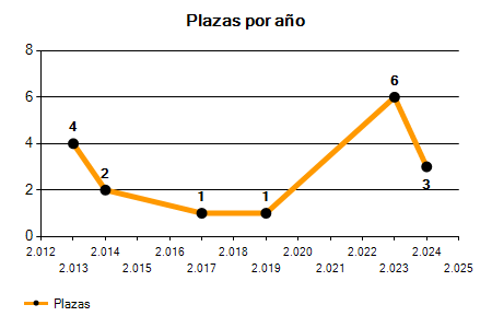 En los siguientes gráficos se puede ver la evolución del número de convocatorias y plazas convocadas para la profesión de Vigilante en Granada de los últimos años pudiéndose observar una caída del 100,00% desde el año 2013 hasta el 2025 en número de convocatorias y una caída del 100,00% en número de plazas convocadas.